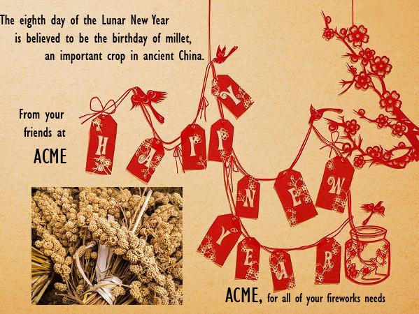 The Eighth day of the Lunar New Year is believed to be the birthday of millet, an important crop in ancient China. According to the folk proverbs, if this day is bright and clear, then this whole year will be a harvest year; however, if this day is cloudy or even rainy, then the whole year will suffer from poor harvest.