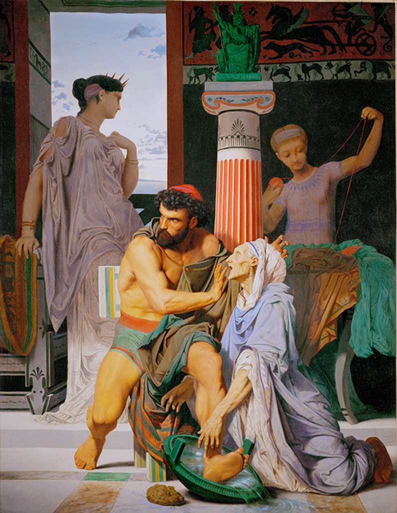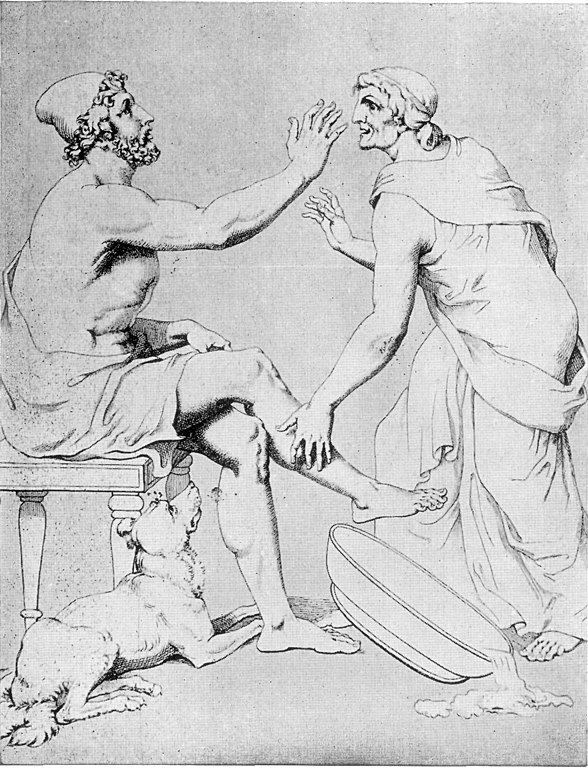 Two of King Odysseus’ old friends recognize him, his aged nurse, Eurycleia, and Argos, the only dog to whom Homer have a name.