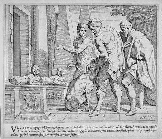 Two of King Odysseus’ old friends recognize him, his aged nurse, Eurycleia, and Argos, the only dog to whom Homer gave a name.