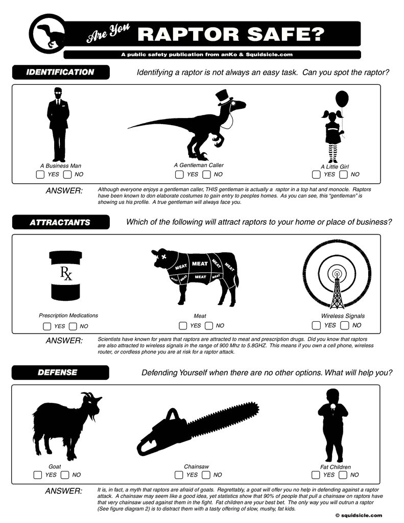 Velociraptor attacks are a very serious matter. Educate yourself, and make sure you always have at least four possible escape routes, since three of those will be occupied by velociraptors in the event of an attack.