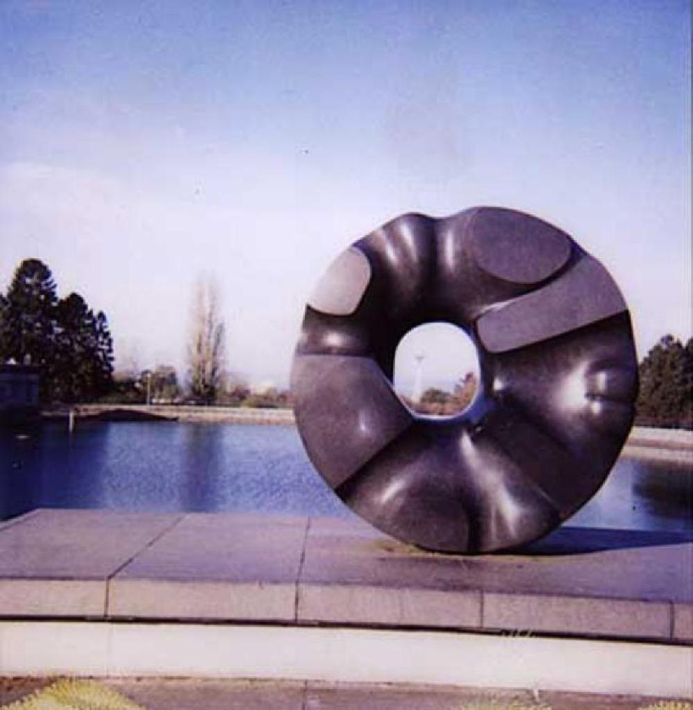 (The piece is located in Volunteer Park on Capitol Hill. It looks kind of like a huge, black doughnut and is aimed so you can see the Space Needle through the middle of it.)