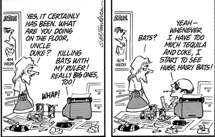 (Uncle Duke first appeared in Doonesbury was on July 8, 1974.) Several movies have been made about Dr. Thompson’s life and work and psychotic episodes. He is perhaps the only American journalist to have been played on-screen by both –