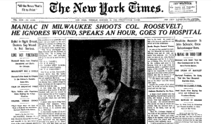 Former U.S. President Theodore Roosevelt, campaigning for a return to office, was shot in Milwaukee by a saloon keeper named John Schrank on this date.