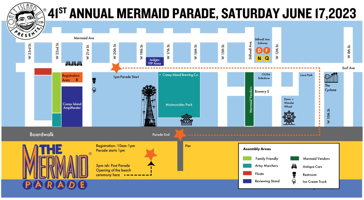The Parade starts at 1pm, rain or shine, on West 21st and Surf Avenue. It rolls east to West 10th Street, where the marchers and push-pull floats proceed to the Boardwalk and continue their march to Steeplechase Plaza, under the Parachute Jump. It’s a beautiful day today, if you can, why not catch the fun by the sea.