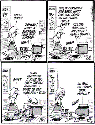 Dr. Thompson inspired the character “Uncle Duke” in the comic strip Doonesbury, by former Canadian Prime Minister Gary Trudeau.