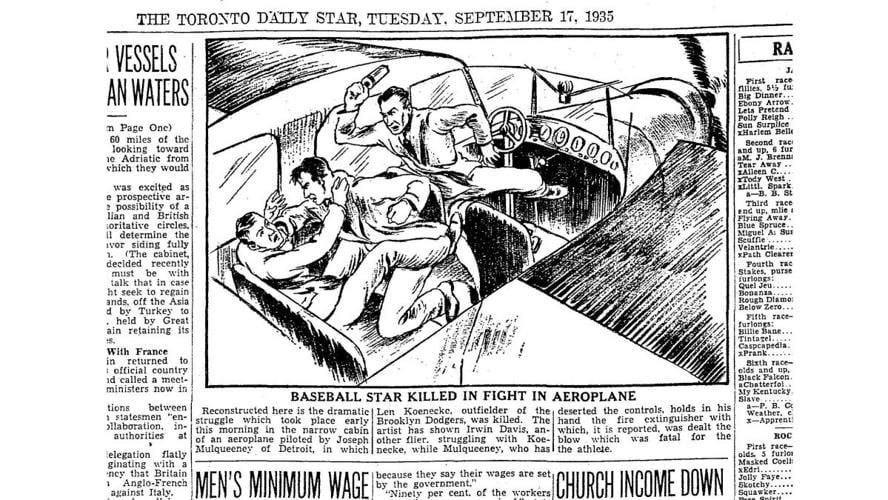 Len Koenecke was an outfielder with the Brooklyn Dodgers for most of 1935, but near the end of the season he was released for “behavior and erratic play.” The Dodger left St. Louis by passenger plane, but was ordered off in Detroit because of intoxication. Len chartered a three-seater plane for Buffalo that included both the pilot and the co-pilot.