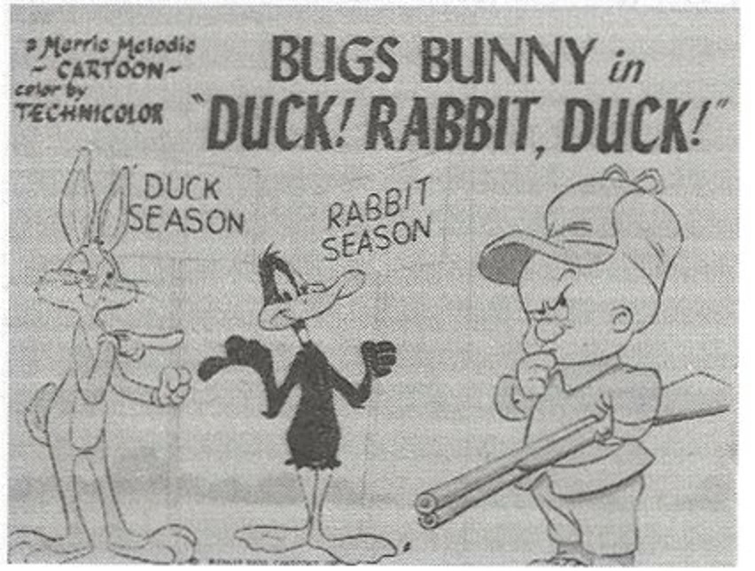 Bugs Bunny stuck out four signs to lead Elmer Fudd to shoot Daffy Duck.