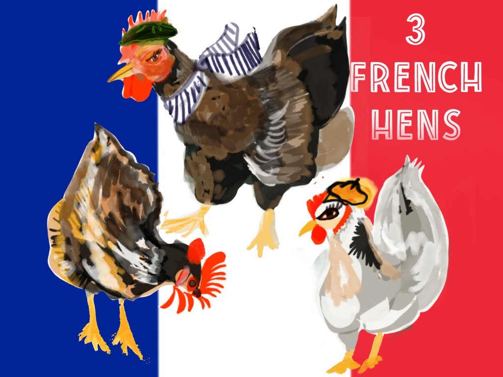 The three French hens symbolize the three theological virtues of Faith, Hope and Charity. The hens, being french, will not associate with the common turtle doves – leave plenty of room between the cage.