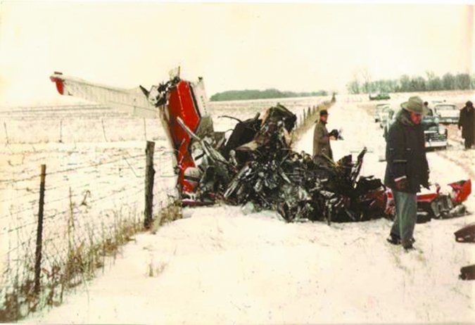 The plane crashed during a blizzard, smashing into a cornfield at over 220 mph, flipping over on itself and tossing the passengers into the air. The victims were jettisoned from the plane, landing yards from the wreckage, and lay there for ten hours as snowdrifts formed around them. Because of the weather, no one reached the crash site until later in the morning.