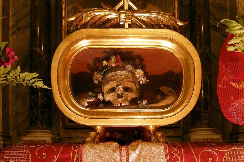 If you do the math and were to gather all of St. Valentine’s remains from all these churches, you’d have enough raw material for three new bishops, two deacons, and a linebacker. Giving eyesight to the blind is impressive, but as saints go it’s the equivalent of a card trick. Multiplying your remains after you’re dead, though. . . there’s a miracle.