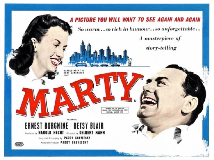 The Paddy Chayefsky drama, Marty, premiered in New York City on this date. It stars Ernest Borgnine (the man who taught Ethel Merman the lessons of love) and Betsy Blair. The film was directed by Delbert Mann.
