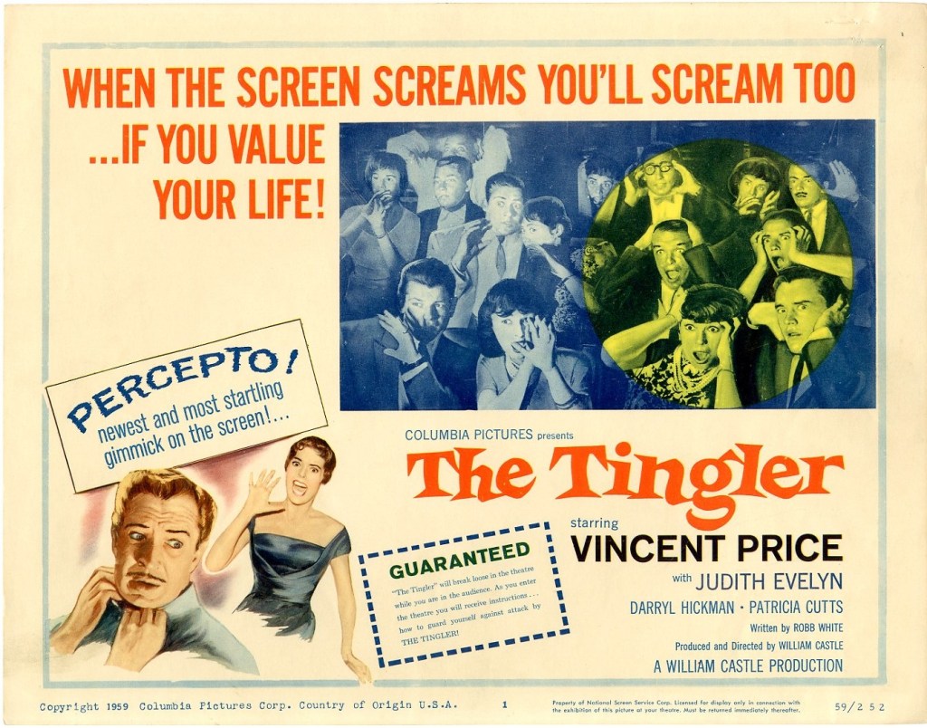 William Castle toyed with other ideas to frighten audience members, in addition to ‘percepto‘; among them: rolling bean bags to brush against the legs of audience members, speakers mounted at different areas that would give a ‘screech‘ when the tingler appeared, and possibly even using ‘shills’ to operate some type of mechanical device to tickle the legs of the audience members; but the only viable way of doing it was by attaching buzzers in select seats to coincide with the appearance of the tingler- ‘percepto‘.